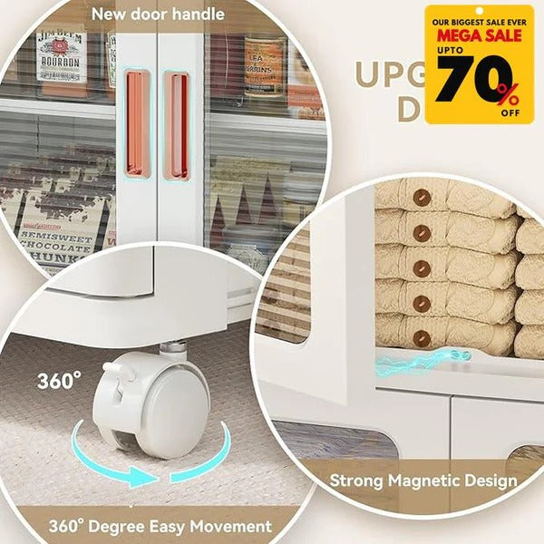 Featuring transparent doors, a spacious design, and smooth-rolling wheels, it’s perfect for organizing your kitchen, living room, or office.