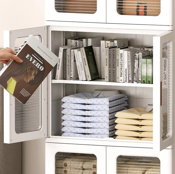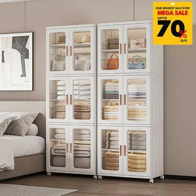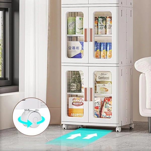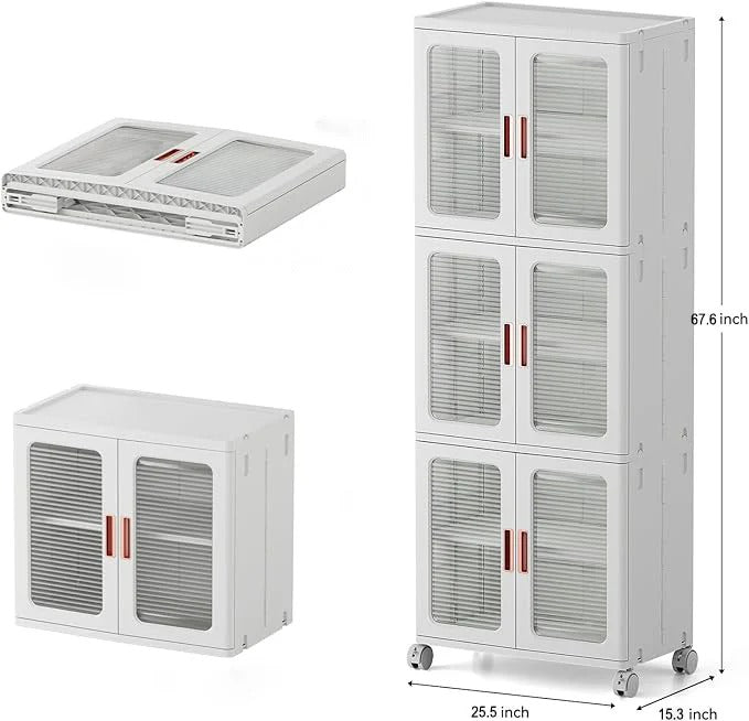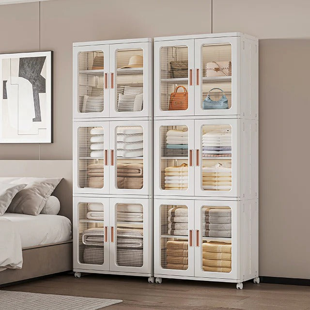 Upgrade your storage with the Acrylic 3-Layer Double Door Stackable Storage Cabinet with Wheels!
