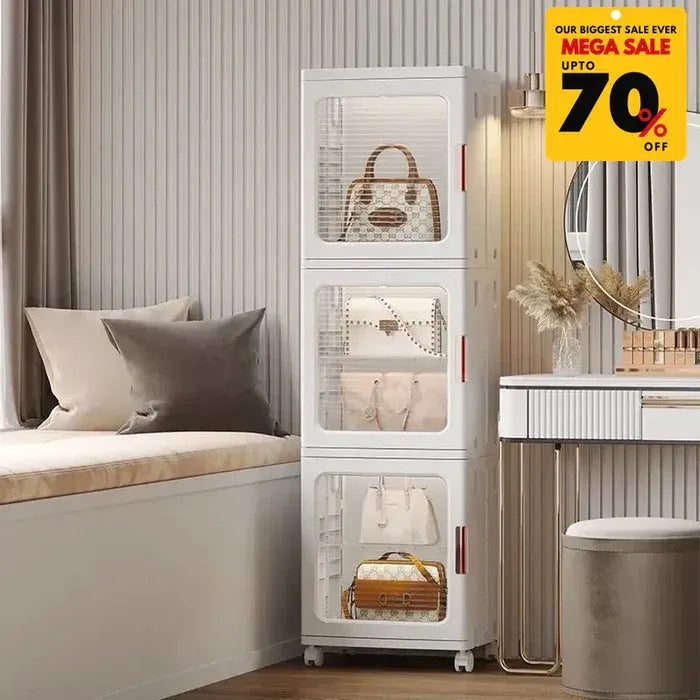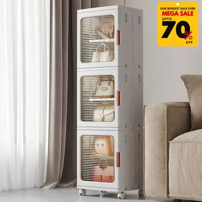 The transparent doors offer easy visibility, while the stackable, modular design and smooth-rolling wheels ensure effortless customization and mobility.