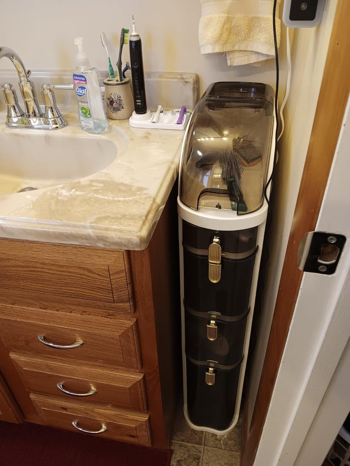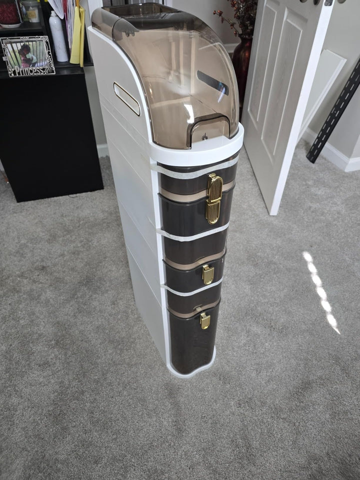 This cabinet features four stackable tiers, providing ample room for organizing various items.