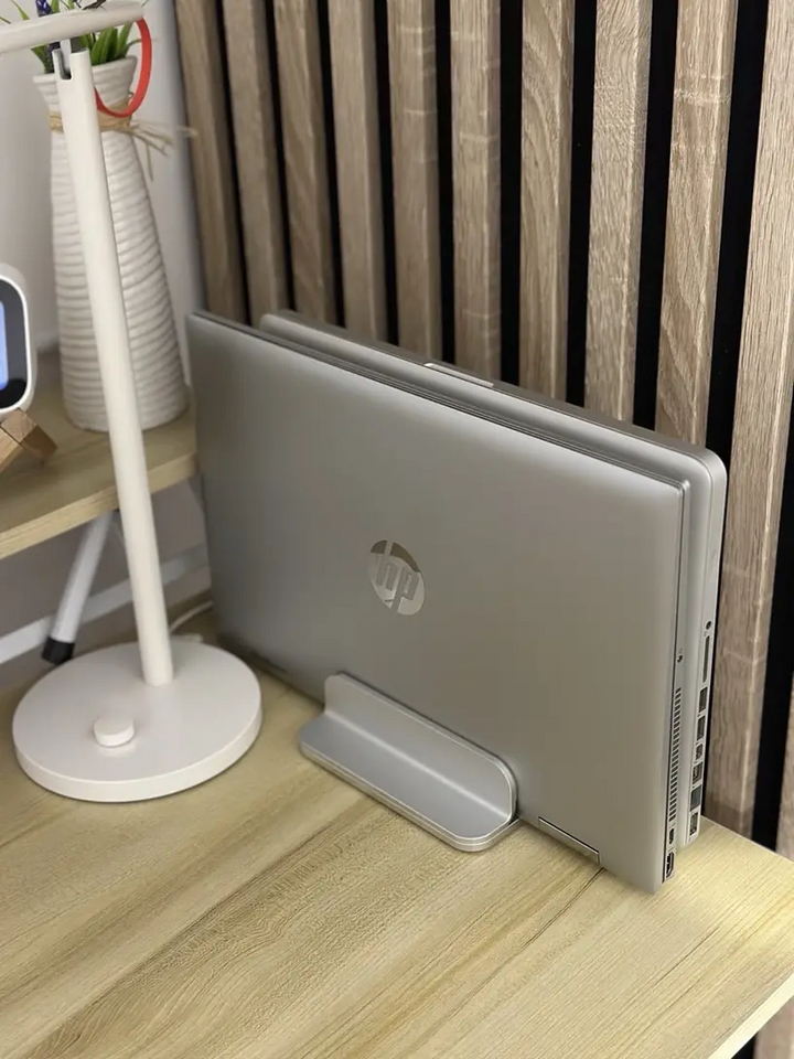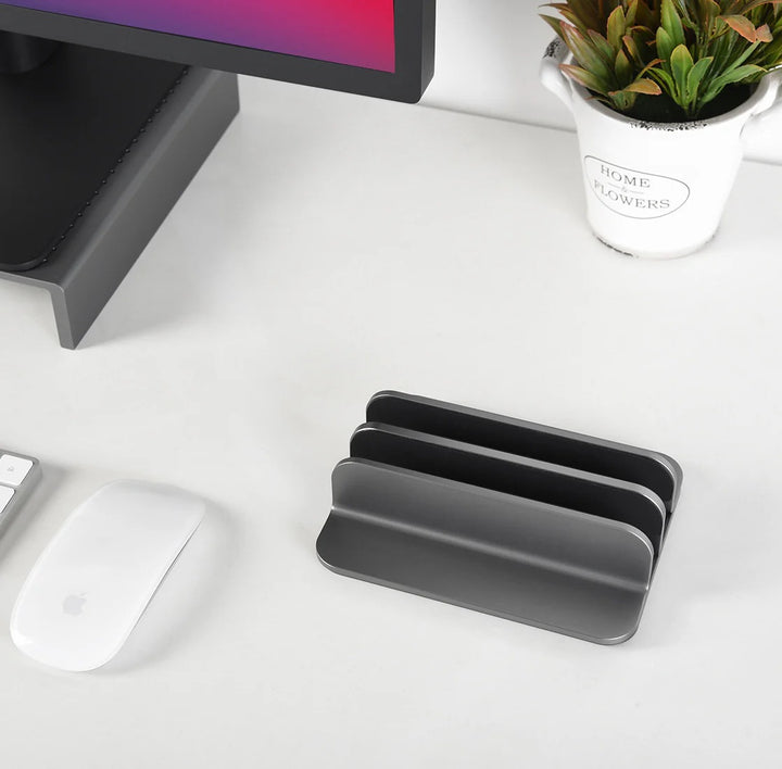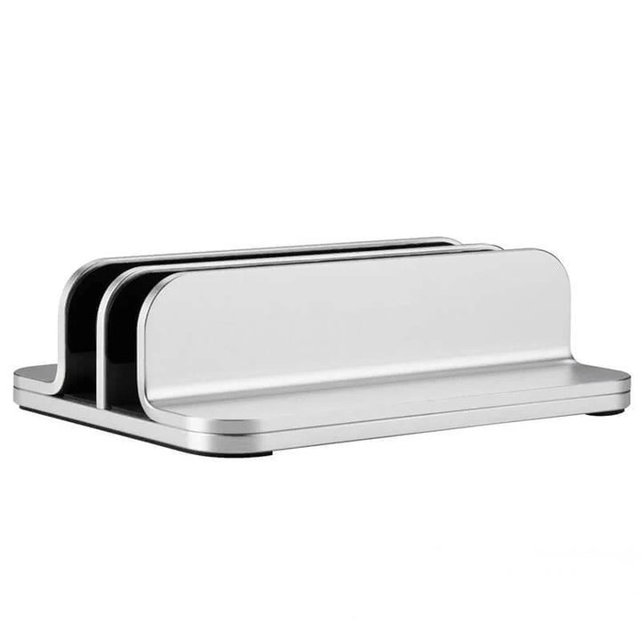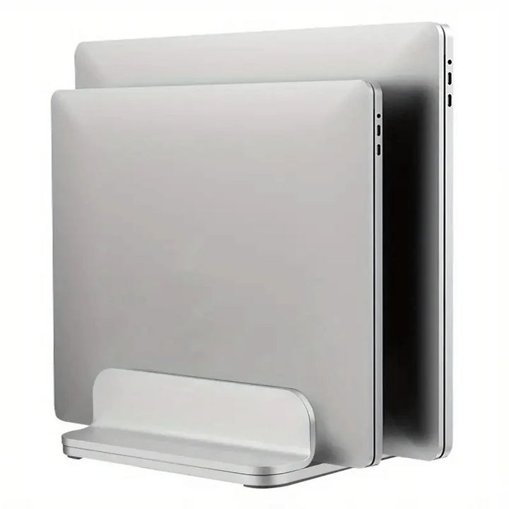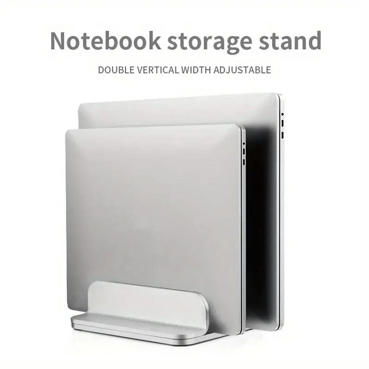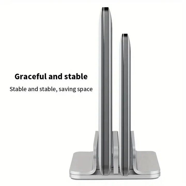 Organize your workspace with the Adjustable DualSlot Laptop Holder. Designed to securely hold two laptops or tablets, this sleek holder optimizes desk space while keeping your devices within easy reach. Its adjustable slots ensure a snug fit for various device sizes, blending style with functionality.